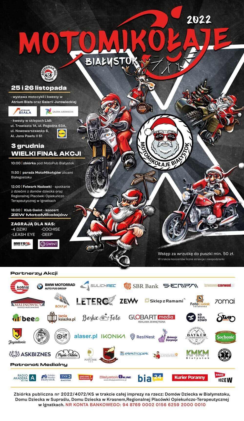 II. Oczywiście wpłat można dokonywać również bezpośrednio na konto bankowe akcji. Przy wpłatach od 50 zł oczywiście też będą dla Was bonusy w postaci koszulek. Jeśli chcecie otrzymać taką motomikołajową koszulkę, wystarczy przy wpłacie dopisać treści przelewu, KOSZULKA + typ koszulki (męska, damska, dziecięca), kolor (zielony/czarny) oraz rozmiar.